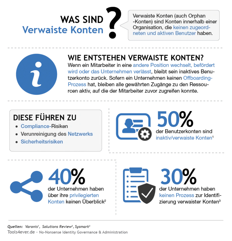 Unvollständiges und nicht automatisiertes User-Lifecycle-Management (User Provisioning) von Benutzerkonten führt in der Regel zur Verbreitung bzw. Vermehrung von verwaisten Benutzerkonten. So ist das automatisierte On- und Offboarding für jedes Unternehmen, jede Organisation der perfekte Prozess, neue Benutzer bei der Einstellung korrekt mit allen Zugängen, Zugriffen und Daten auszustatten. Und beim Offboarding, durch z.B. den Austritt eines Mitarbeiters, die Deprovisionierungsprozesse einzuleiten. Auch wenn Austritte von Mitarbeitern, die häufigste Ursache ist, können jede Reorganisation, jeder Rollenwechsel oder jede Beförderung zu nicht genutzten, verwaisten Benutzerkonten führen.